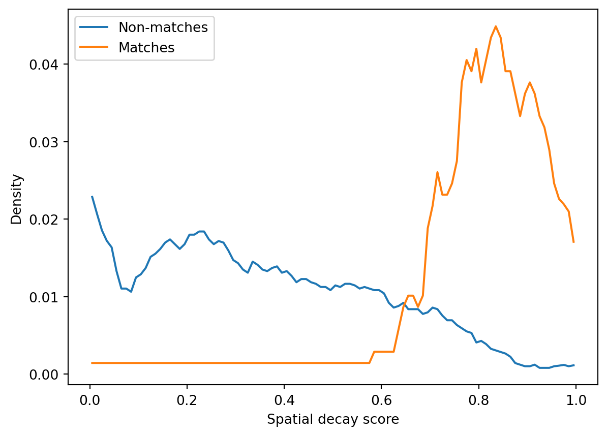 plt.legend()set(xlabel="Spatial decay score", ylabel="Density") ax.
