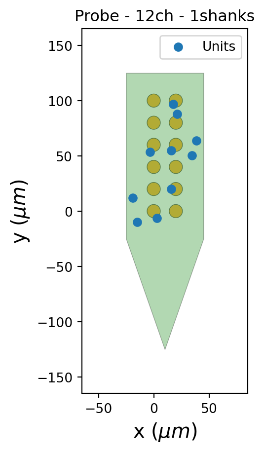 plot_probe(probe, ax0], unit_locations[:, 1], label="Units")