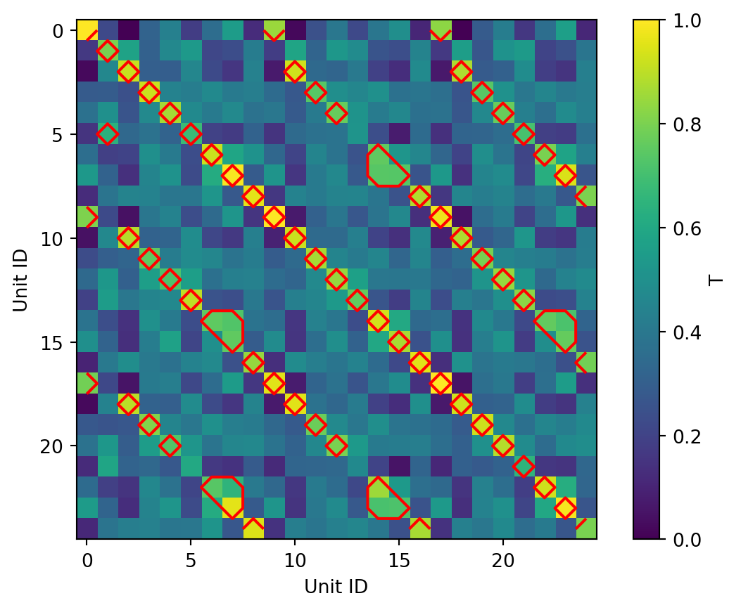 The matrix of matches above shows a clear pattern of bands that run parallel to the diagonal. This is because, in our simulation, units have the same order across recordings. This would not be the case for real recordings where you would see a more random, scattered pattern.