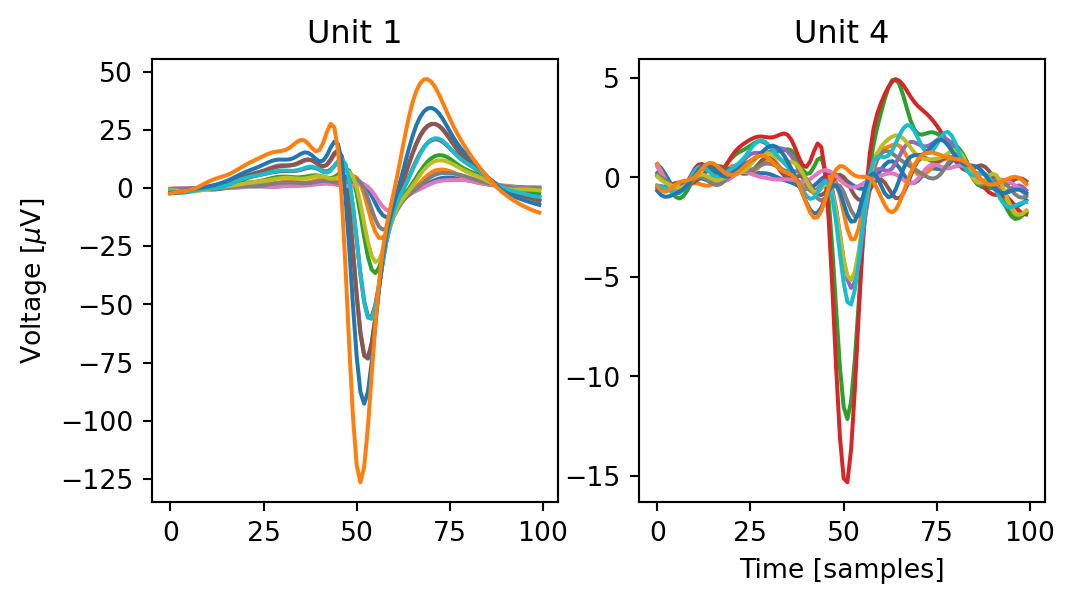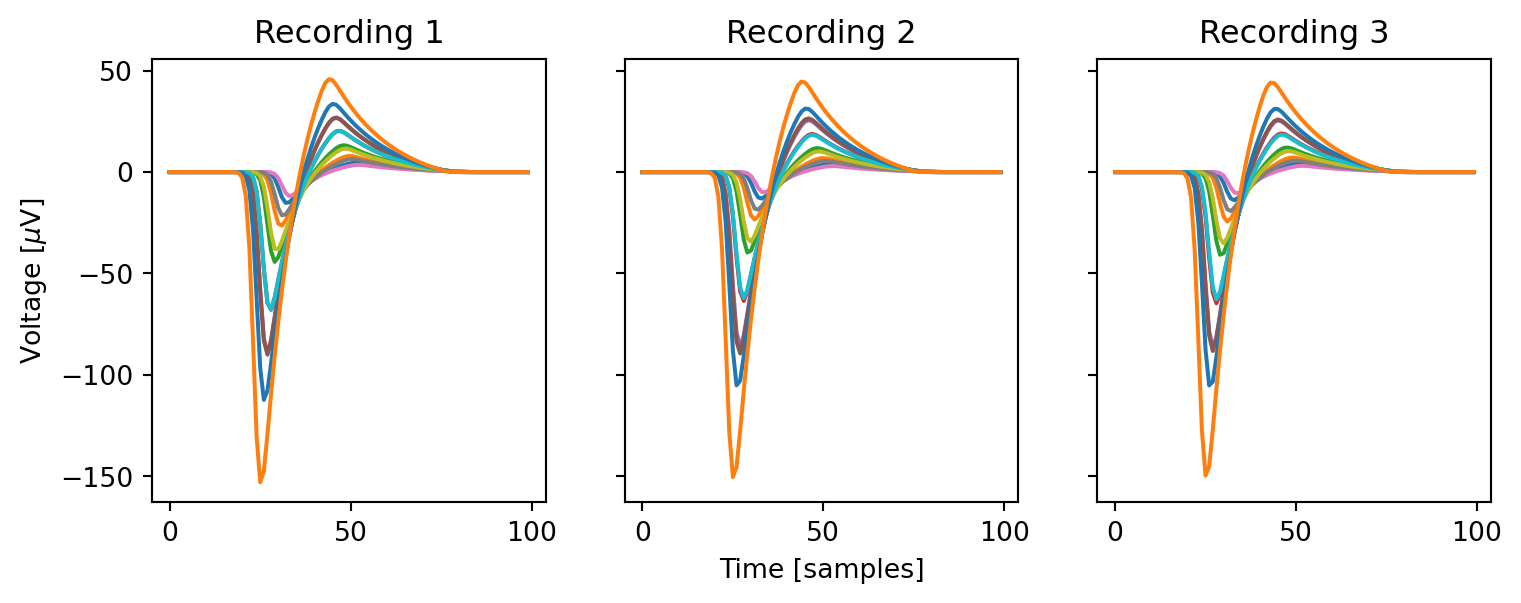 This section simulates multiple electrophysiological recordings and their corresponding spike sorting results. The basic idea is that we generate a template waveform for each unit and then simulate the recordings from these template waveforms. The waveform parameters will be slightly varied across recordings to simulate the variability expected in chronic recordings (e.g. due to movement of the electrodes). First, we need to define the parameters for the simulated data.